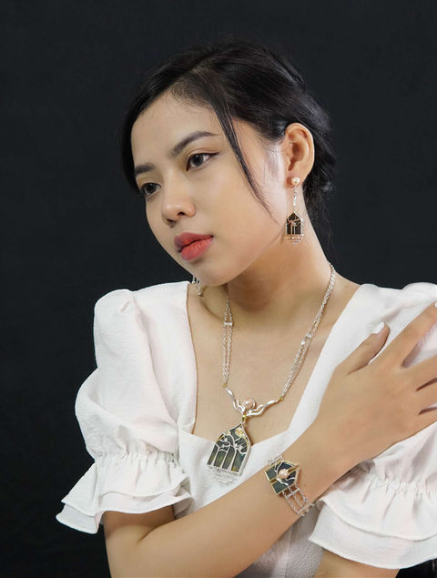 Bộ trang sức là sự kết hợp hài hoà giữa hoa văn kiến trúc Cửa sổ Châu Âu và chất liệu Gốm mang đậm bản sắc văn hoá Việt, củng cố niềm tin và sự yêu thích của giới trẻ đối với chất liệu truyền thống. Màu gốm tông tối giản dị mà sang trọng, kết hợp đường nét kim loại và đá màu khoẻ khoắn, trẻ trung làm tôn gốm lên hơn nữa. Thiết kế không hề rườm rà, chất liệu mộc mạc nhưng lại bắt mắt, mang hơi thở cổ điển lại vừa có tính hiện đại, đáp ứng cho nhiều mục đích sử dụng của giới trẻ như dạo phố, đi tiệc, hay kể cả triển lãm và trình diễn sân khấu đều độc đáo và toả sáng không hề kém cạnh những bộ trang sức lớn hơn nó. Gốm cũng có giá thành rẻ, người dùng sẽ có nhiều lựa chọn khi sử dụng trang sức hơn.