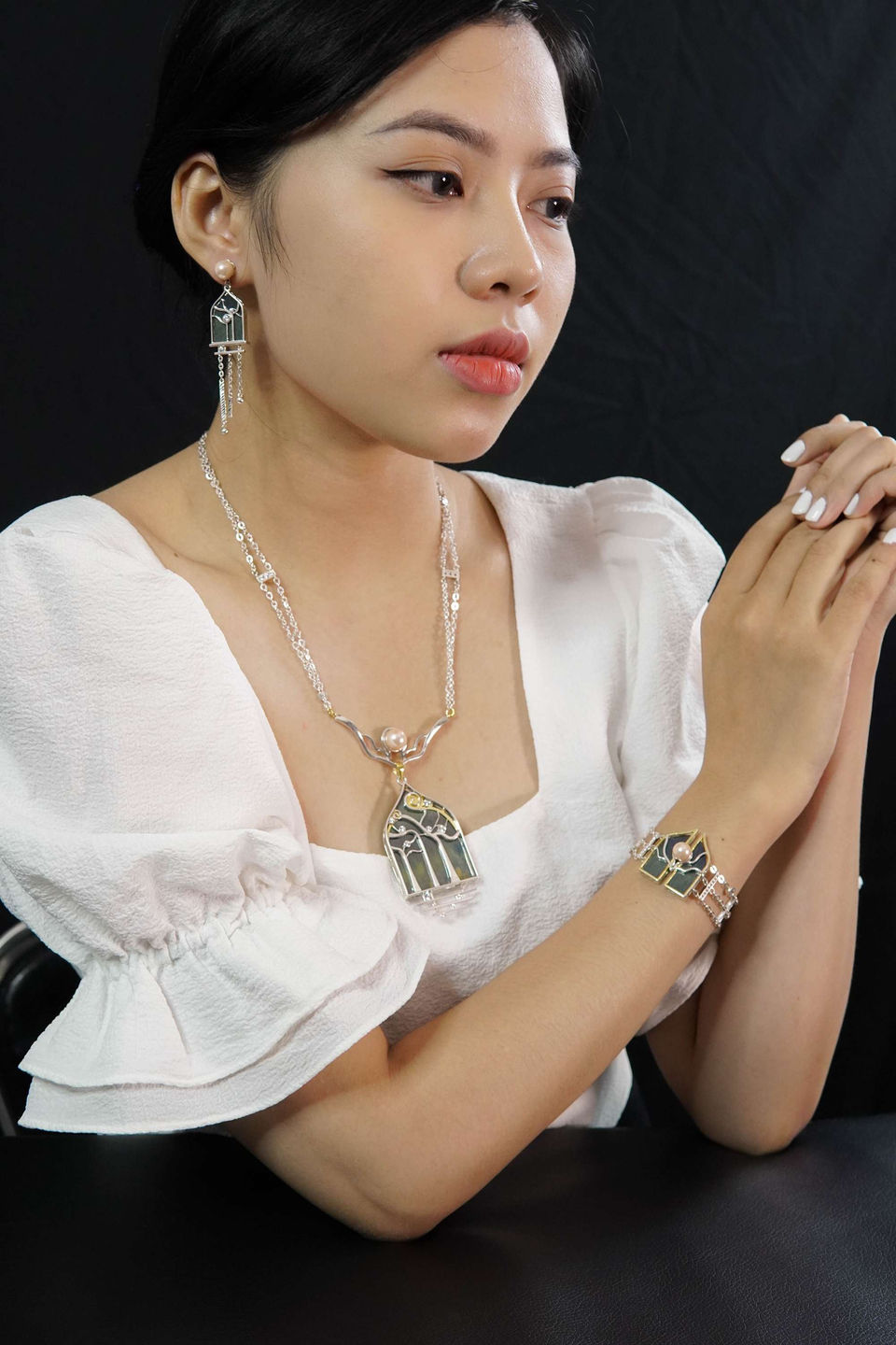 Hai vòng tròn màu vàng là cảnh mặt trời lặn dần về phía Tây, và mặt trăng mọc lên thay thế. Các đường nét bạc có độ dày mỏng khác nhau thể hiện luật xa gần của cây rừng, cùng với nền gốm men hoả biến màu xanh tông tối làm nổi bật lẫn nhau, đồng thời giúp sản phẩm có độ sâu hút mắt hơn. Hạt trai màu hồng cam là điểm nhấn cho các chi tiết khớp nối và phần dây đeo bạc.