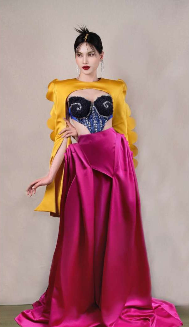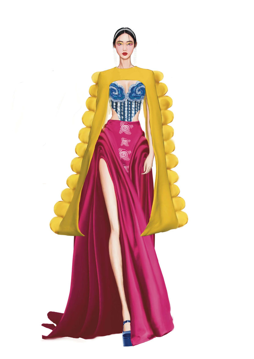 Mẫu thiết kế trong BST được bóc tách từ họa tiết, màu sắc đặc trưng của tranh Hàng Trống kết hợp cùng kỹ thuật in hiện đại và thêu đính thủ công. Từng bộ trang phục được thổi vào hơi thở của hiện đại đan xen giữa những điều xưa cũ quen thuộc, đậm văn hóa Bắc Bộ trong trang phục dạ hội.